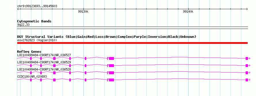 | Known Genes | CCDC180, LOC100499484-C9ORF174 |
