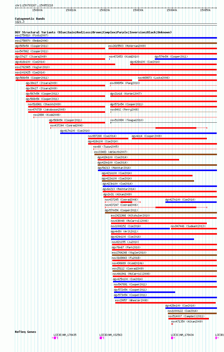 Variant DetailsVariant: esv2762965 | Internal ID | 10377676 | | Landmark | | | Location Information | | | Cytoband | 1q21.3 | | Allele length | | Assembly | Allele length | | hg38 | 59952 | | hg19 | 59952 | | hg18 | 59952 |