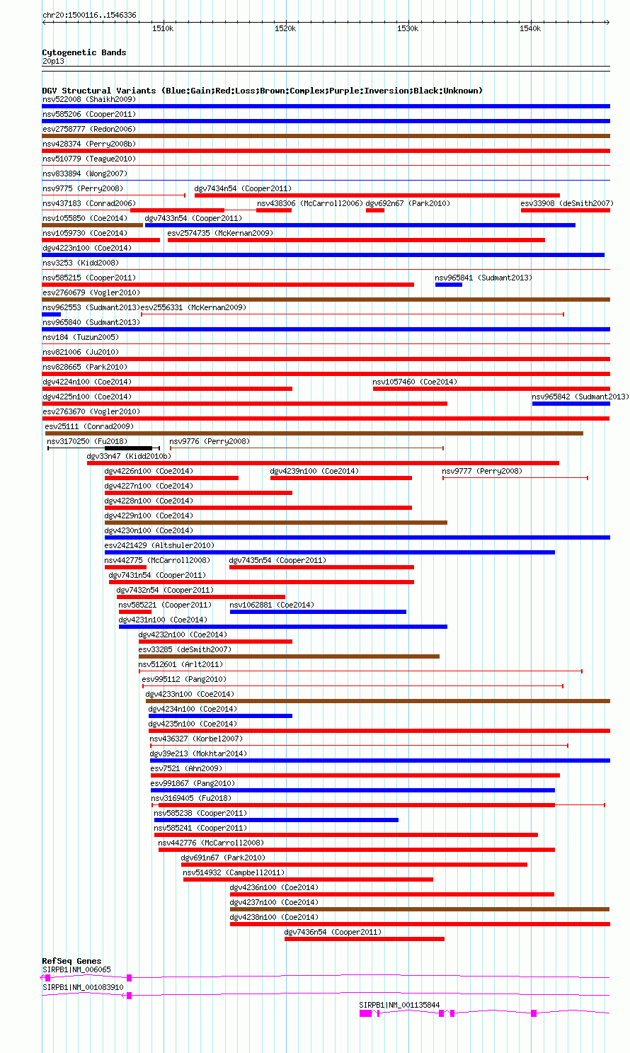 Variant DetailsVariant: esv2763670 | Internal ID | 10376350 | | Landmark | | | Location Information | | | Cytoband | 20p13 | | Allele length | | Assembly | Allele length | | hg38 | 46221 | | hg19 | 46221 | | hg18 | 46221 |
