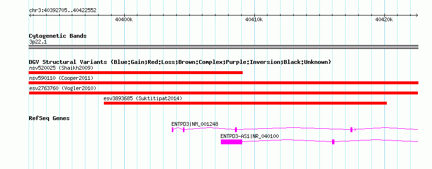 Variant DetailsVariant: esv2763760| Internal ID | 10377796 | | Landmark | | | Location Information | | | Cytoband | 3p22.1 | | Allele length | | Assembly | Allele length | | hg38 | 29848 | | hg19 | 29848 | | hg18 | 29848 |