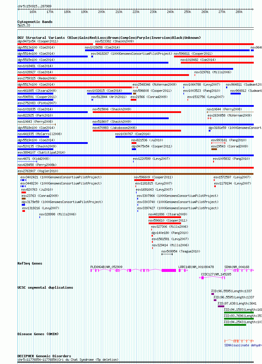 Variant DetailsVariant: esv2763907| Internal ID | 10031257 | | Landmark | | | Location Information | | | Cytoband | 5p15.33 | | Allele length | | Assembly | Allele length | | hg38 | 137075 | | hg19 | 137075 | | hg18 | 137075 |