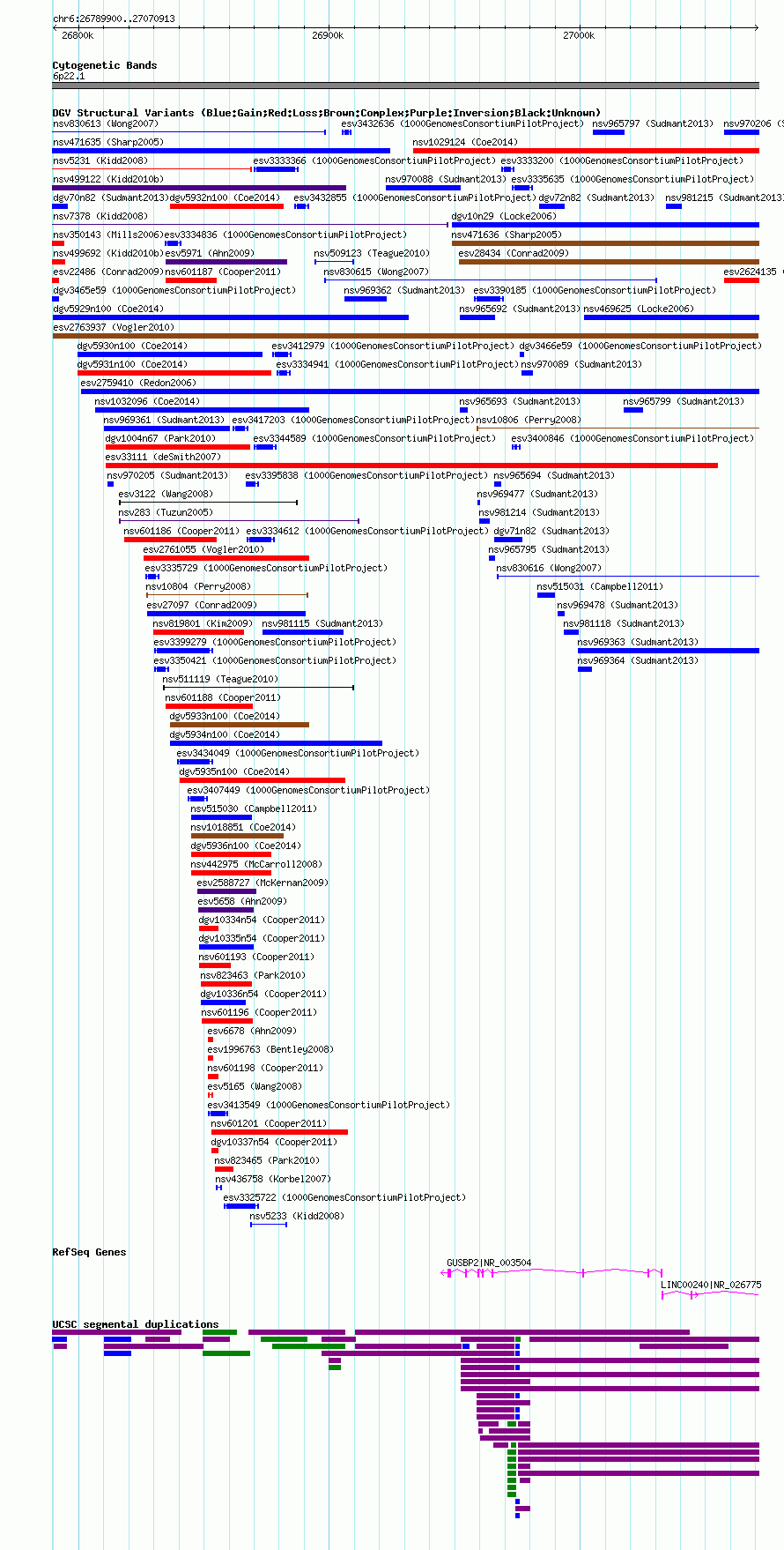 Variant DetailsVariant: esv2763937 | Internal ID | 10031287 | | Landmark | | | Location Information | | | Cytoband | 6p22.1 | | Allele length | | Assembly | Allele length | | hg38 | 313463 | | hg19 | 281014 | | hg18 | 281014 |