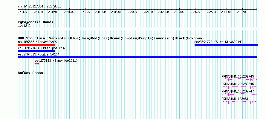 Variant DetailsVariant: esv2764013| Internal ID | 10031363 | | Landmark | | | Location Information | | | Cytoband | 10p12.2 | | Allele length | | Assembly | Allele length | | hg38 | 152048 | | hg19 | 152048 | | hg18 | 152048 |