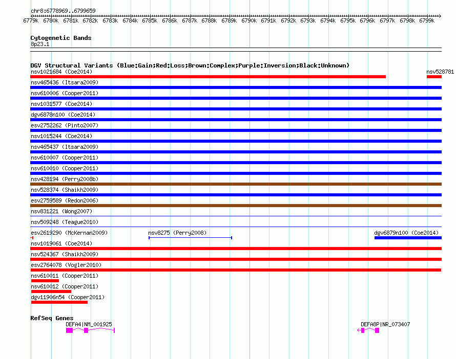 Variant DetailsVariant: esv2764078| Internal ID | 10031428 | | Landmark | | | Location Information | | | Cytoband | 8p23.1 | | Allele length | | Assembly | Allele length | | hg38 | 20691 | | hg19 | 20691 | | hg18 | 20691 |