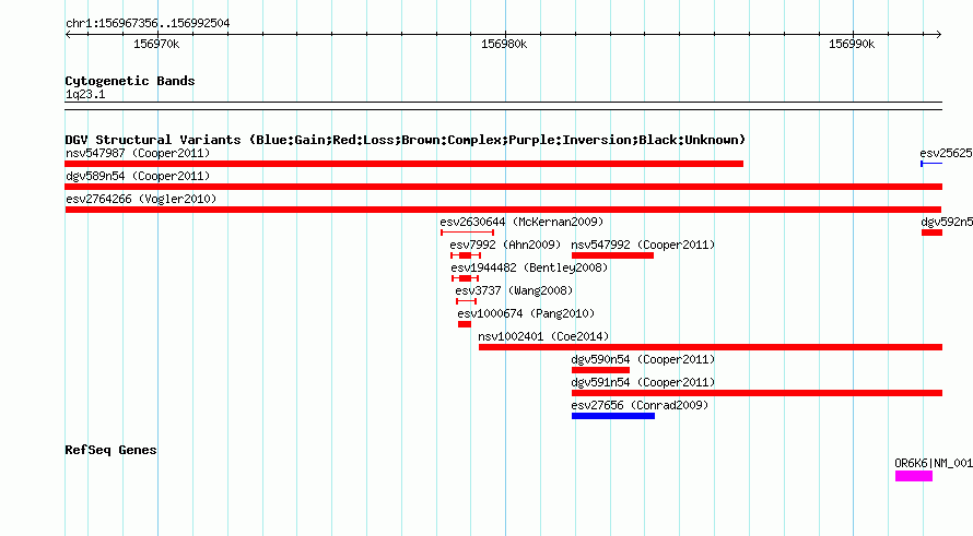 Variant DetailsVariant: esv2764266| Internal ID | 10031616 | | Landmark | | | Location Information | | | Cytoband | 1q23.1 | | Allele length | | Assembly | Allele length | | hg38 | 25149 | | hg19 | 25149 | | hg18 | 25149 |