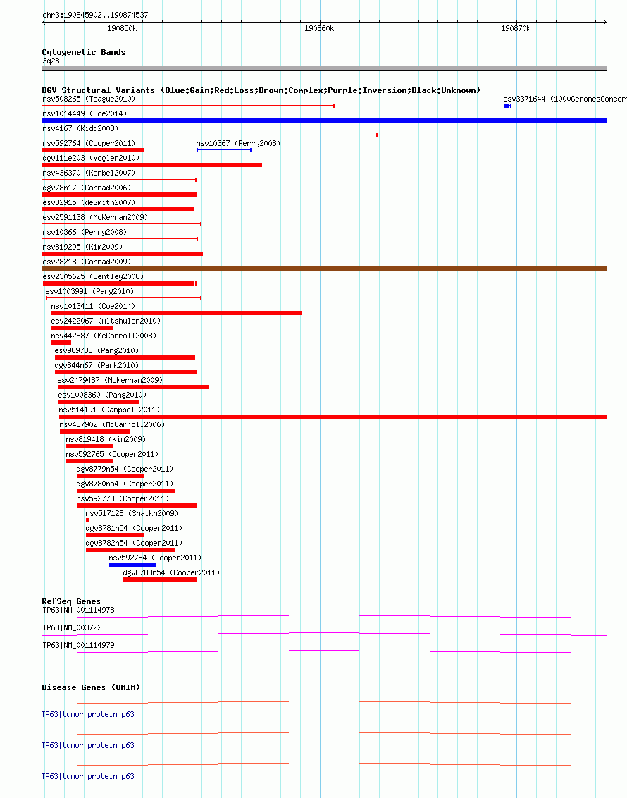 | | Variant Type | CNV gain+loss | | Copy Number | | | Allele State | | | Allele Origin | | | Probe Count | | | Validation Flag | | | Merged Status | M | | Merged Variants | | | Supporting Variants | esv11225, esv15928 | | Samples | NA18502, NA18508, NA11931, NA19190, NA18907, NA19114, NA19099, NA19225, NA19108, NA18505 | | Known Genes | TP63 | | Method | Oligo aCGH | | Analysis | Segment log2 ratios from each sample. This was done running the GADA algorithm (Pique-Regi et al., 2008) using the options "-M 10 -T 10 -a 2.5". Filter non-CNV segments using intensity thresholds. Merge remaining CNV "calls" within each sample. Adjacent calls of the same direction (gain or loss) are merged if both: the distance between calls is less than 10kb, and the distance between calls is less than 10% of the size of the largest of the two calls. | | Platform | Sanger H. Sapiens 42mCGH Array 5781_53 726K v1 | | Comments | | | Reference | Conrad_et_al_2009 | | Pubmed ID | 19812545 | | Accession Number(s) | esv28218