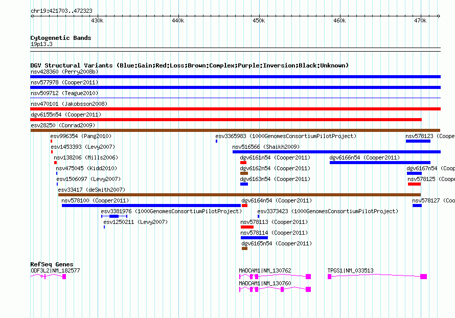 | | Variant Type | CNV gain+loss | | Copy Number | | | Allele State | | | Allele Origin | | | Probe Count | | | Validation Flag | | | Merged Status | M | | Merged Variants | | | Supporting Variants | esv12873, esv18199, esv21188, esv18865, esv10417, esv13712 | | Samples | NA18508, NA12414, NA12156, NA12044, NA19225, NA18858, NA19240, NA19129 | | Known Genes | MADCAM1, ODF3L2, TPGS1 | | Method | Oligo aCGH | | Analysis | Segment log2 ratios from each sample. This was done running the GADA algorithm (Pique-Regi et al., 2008) using the options "-M 10 -T 10 -a 2.5". Filter non-CNV segments using intensity thresholds. Merge remaining CNV "calls" within each sample. Adjacent calls of the same direction (gain or loss) are merged if both: the distance between calls is less than 10kb, and the distance between calls is less than 10% of the size of the largest of the two calls. | | Platform | Sanger H. Sapiens 42mCGH Array 5781_53 726K v1 | | Comments | | | Reference | Conrad_et_al_2009 | | Pubmed ID | 19812545 | | Accession Number(s) | esv28250