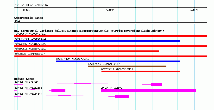|  | Variant Type | CNV loss |  | Copy Number |  |  | Allele State |  |  | Allele Origin |  |  | Probe Count |  |  | Validation Flag |  |  | Merged Status | M |  | Merged Variants |  |  | Supporting Variants | esv18777, esv18959, esv19554 |  | Samples | NA11995, NA19190, NA12156, NA11993, NA12489, NA12749 |  | Known Genes | EIF4E3, GPR27 |  | Method | Oligo aCGH |  | Analysis | Segment log2 ratios from each sample. This was done running the GADA algorithm (Pique-Regi et al., 2008) using the options "-M 10 -T 10 -a 2.5". Filter non-CNV segments using intensity thresholds. Merge remaining CNV "calls" within each sample. Adjacent calls of the same direction (gain or loss) are merged if both: the distance between calls is less than 10kb, and the distance between calls is less than 10% of the size of the largest of the two calls. |  | Platform | Sanger H. Sapiens 42mCGH Array 5781_53 726K v1 |  | Comments |  |  | Reference | Conrad_et_al_2009 |  | Pubmed ID | 19812545 |  | Accession Number(s) | esv28633
