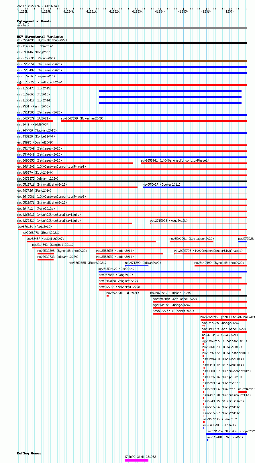 Variant DetailsVariant: esv2947124| Internal ID | 10966790 | | Landmark | | | Location Information | | | Cytoband | 17q21.2 | | Allele length | | Assembly | Allele length | | hg38 | 10001 | | hg19 | 10001 |