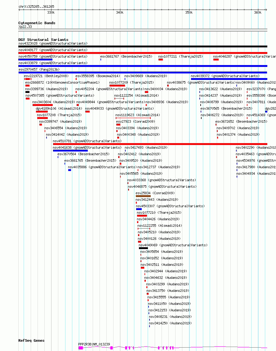 | Variant Type | CNV duplication | Copy Number | | Allele State | | Allele Origin | | Probe Count | | Validation Flag | | Merged Status | M | Merged Variants | | Supporting Variants | essv7240024 | Samples | HuRef | Known Genes | PPP2R3B | Method | Sequencing | Analysis | | Platform | Complete Genomics | Comments | | Reference | Pang_et_al_2013b | Pubmed ID | 24192839 | Accession Number(s) | esv2970457