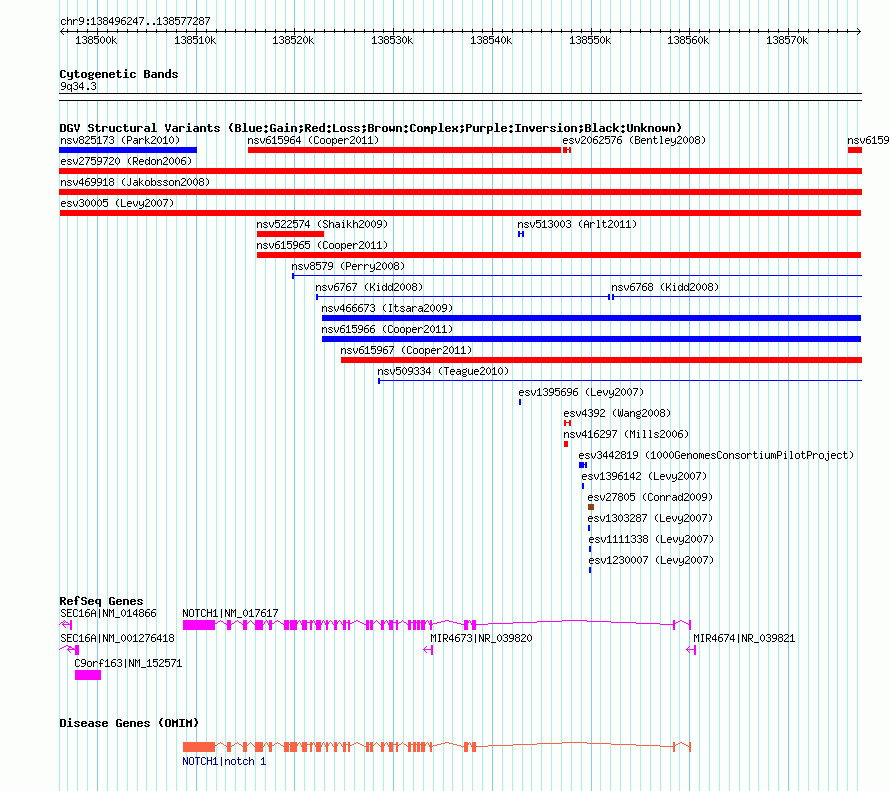 | | Variant Type | CNV loss | | Copy Number | | | Allele State | | | Allele Origin | | | Probe Count | | | Validation Flag | | | Merged Status | M | | Merged Variants | | | Supporting Variants | essv84244 | | Samples | HuRef | | Known Genes | C9orf163, MIR4673, MIR4674, NOTCH1, SEC16A | | Method | Merging | | Analysis | No Reference, merging experiment | | Platform | Not Reported | | Comments | | | Reference | Levy_et_al_2007 | | Pubmed ID | 17803354 | | Accession Number(s) | esv30005