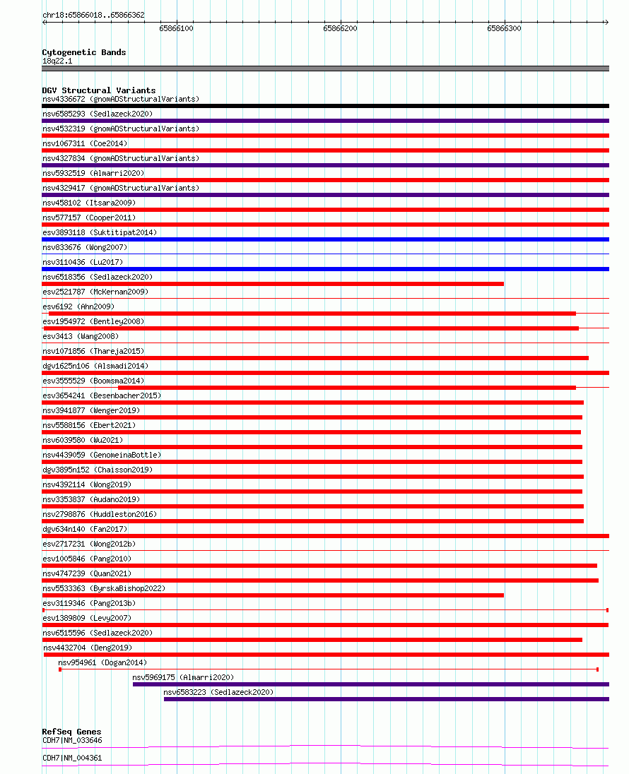 | | Variant Type | CNV deletion | | Copy Number | | | Allele State | | | Allele Origin | | | Probe Count | | | Validation Flag | | | Merged Status | M | | Merged Variants | | | Supporting Variants | essv7388913 | | Samples | HuRef | | Known Genes | CDH7 | | Method | Sequencing | | Analysis | | | Platform | Complete Genomics | | Comments | | | Reference | Pang_et_al_2013b | | Pubmed ID | 24192839 | | Accession Number(s) | esv3119346