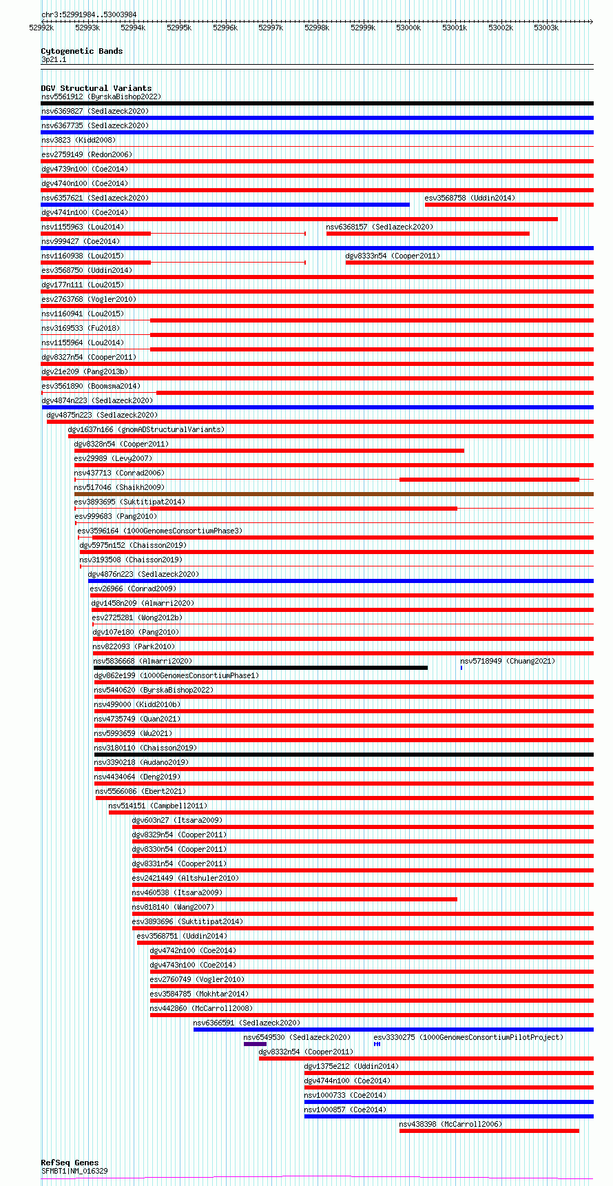 Variant DetailsVariant: esv3197123| Internal ID | 11216789 | | Landmark | | | Location Information | | | Cytoband | 3p21.1 | | Allele length | | Assembly | Allele length | | hg38 | 12001 | | hg19 | 12001 |