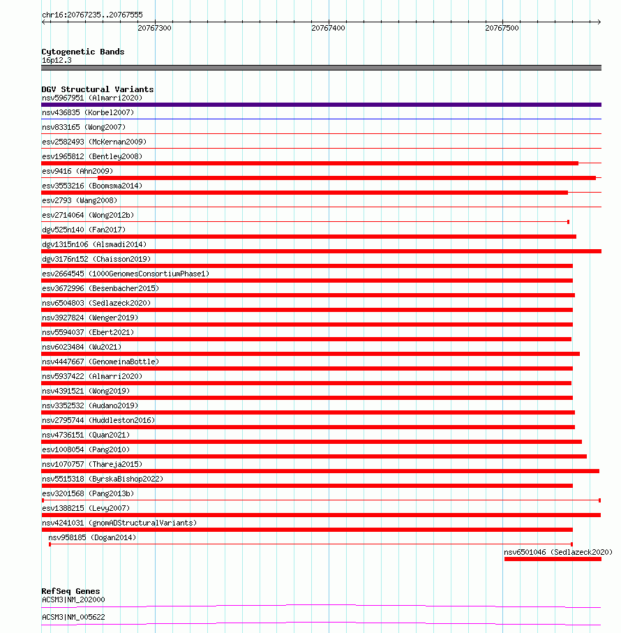 Variant DetailsVariant: esv3201568| Internal ID | 11221234 | | Landmark | | | Location Information | | | Cytoband | 16p12.3 | | Allele length | | Assembly | Allele length | | hg38 | 321 | | hg19 | 321 |
