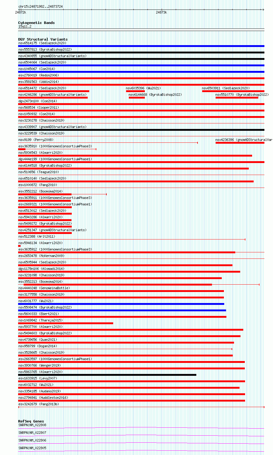 Variant DetailsVariant: esv3242679| Internal ID | 11262345 | | Landmark | | | Location Information | | | Cytoband | 15q11.2 | | Allele length | | Assembly | Allele length | | hg38 | 1743 | | hg19 | 1743 |
