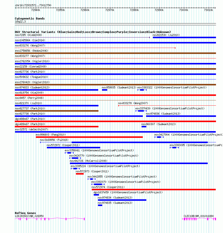 Variant DetailsVariant: esv32572 | Internal ID | 12964516 | | Landmark | | | Location Information | | | Cytoband | 16q22.3 | | Allele length | | Assembly | Allele length | | hg38 | 81219 | | hg19 | 81219 | | hg18 | 81219 | | hg17 | 81219 |