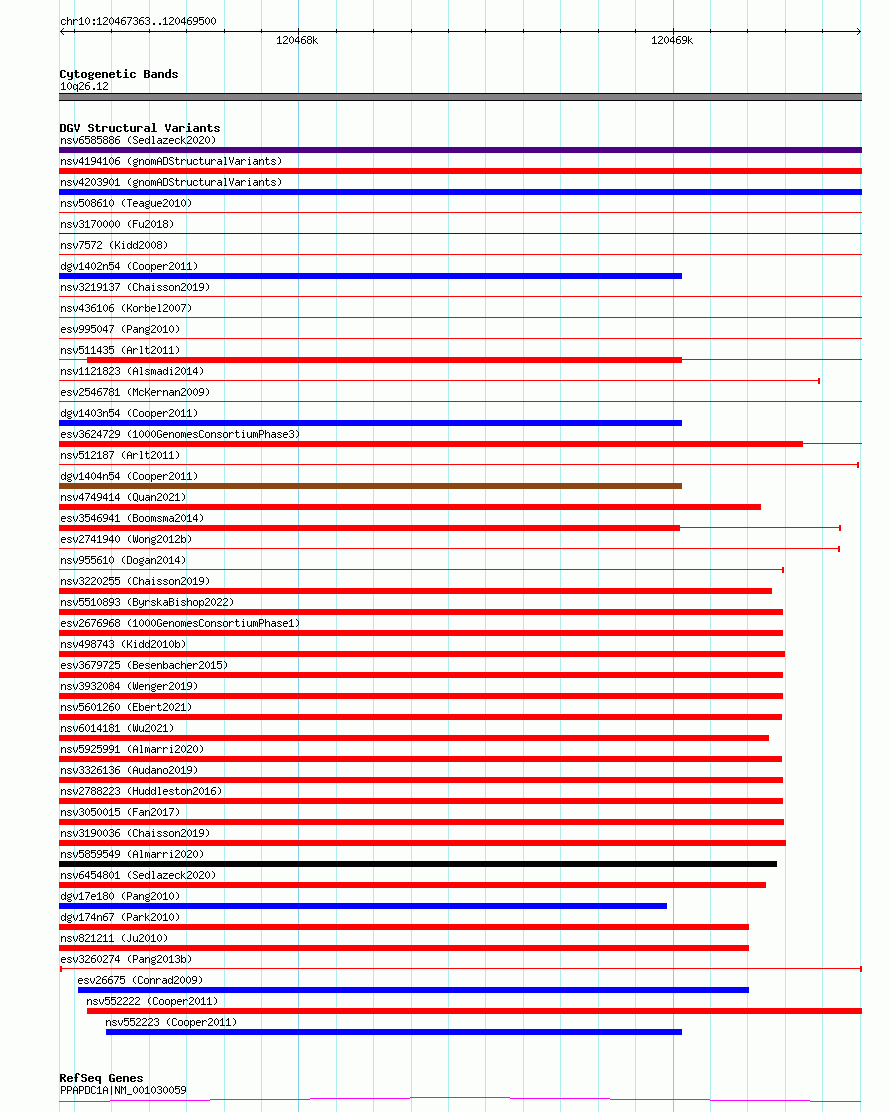 Variant DetailsVariant: esv3260274| Internal ID | 11279940 | | Landmark | | | Location Information | | | Cytoband | 10q26.12 | | Allele length | | Assembly | Allele length | | hg38 | 2138 | | hg19 | 2138 |