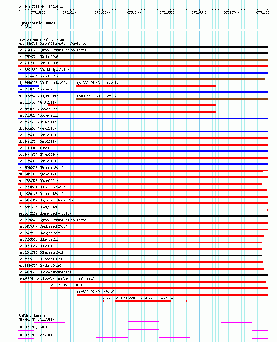 | | Variant Type | CNV deletion | | Copy Number | | | Allele State | | | Allele Origin | | | Probe Count | | | Validation Flag | | | Merged Status | M | | Merged Variants | | | Supporting Variants | essv7531285 | | Samples | HuRef | | Known Genes | MINPP1 | | Method | Sequencing | | Analysis | | | Platform | Complete Genomics | | Comments | | | Reference | Pang_et_al_2013b | | Pubmed ID | 24192839 | | Accession Number(s) | esv3261718