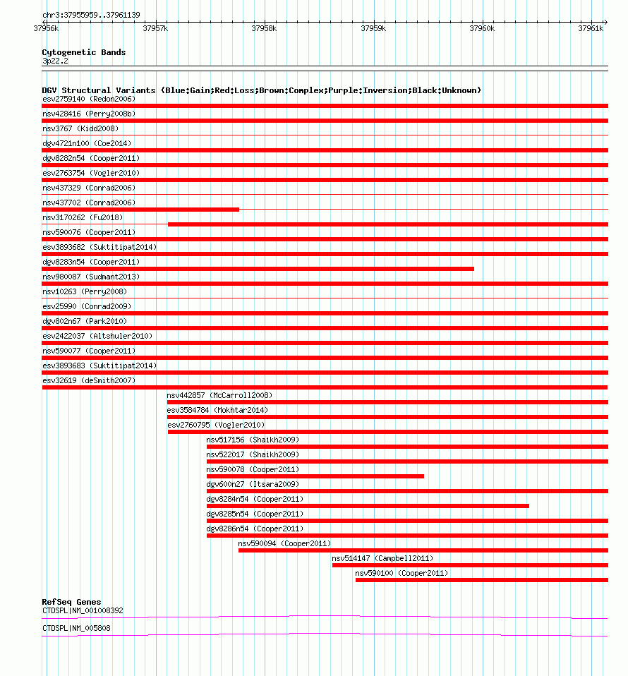 Variant DetailsVariant: esv32619 | Internal ID | 12964563 | | Landmark | | | Location Information | | | Cytoband | 3p22.2 | | Allele length | | Assembly | Allele length | | hg38 | 5181 | | hg19 | 5181 | | hg18 | 5181 | | hg17 | 5181 |