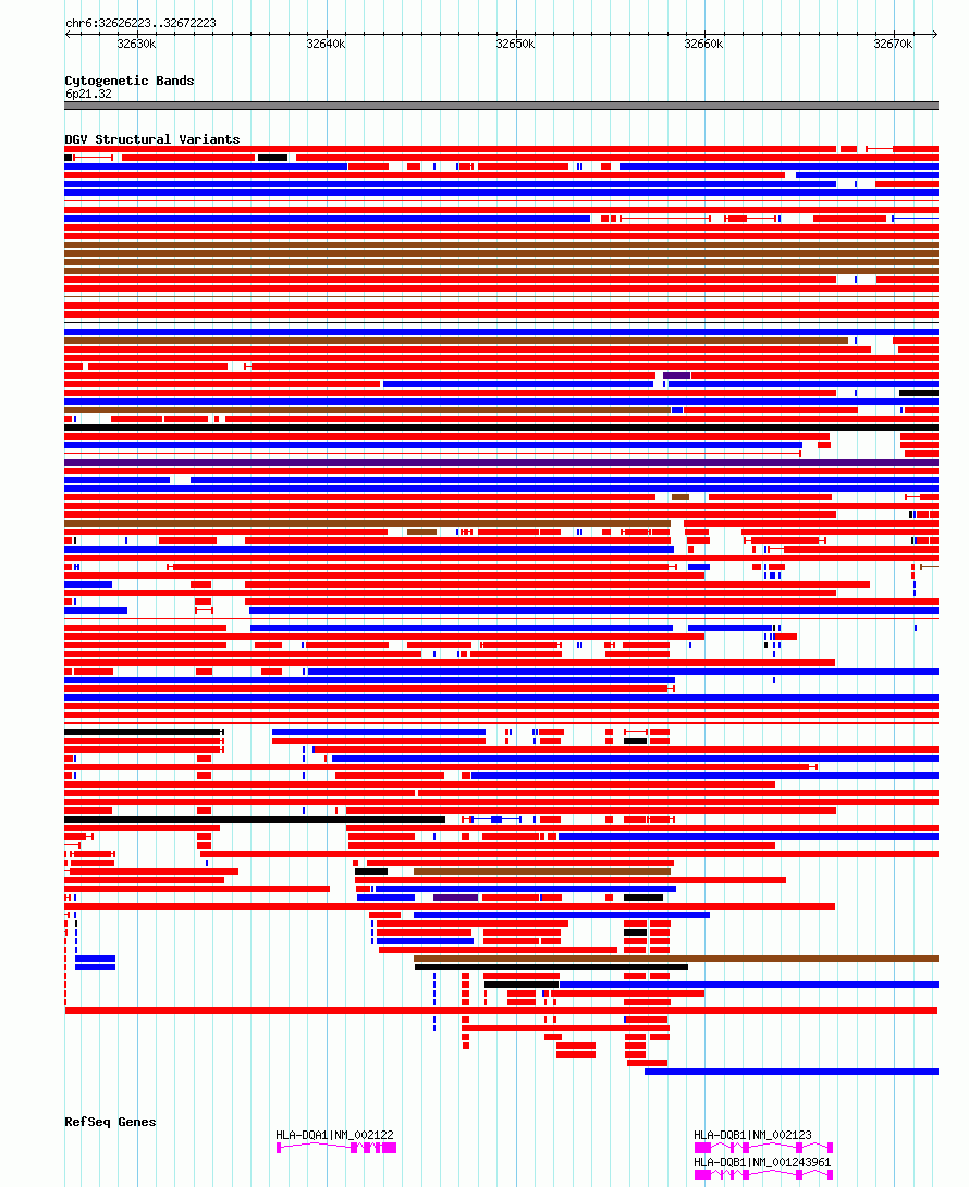 Variant DetailsVariant: esv3274495| Internal ID | 11294161 | | Landmark | | | Location Information | | | Cytoband | 6p21.32 | | Allele length | | Assembly | Allele length | | hg38 | 46001 | | hg19 | 46001 |