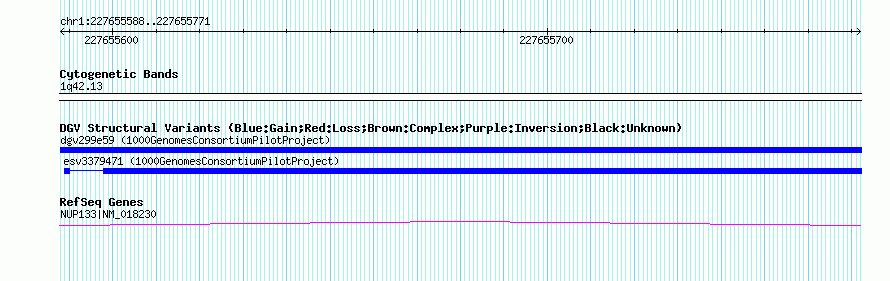 |  | Variant Type | CNV tandem duplication |  | Copy Number |  |  | Allele State |  |  | Allele Origin |  |  | Probe Count |  |  | Validation Flag |  |  | Merged Status | M |  | Merged Variants | dgv299e59 |  | Supporting Variants | essv7730970, essv7731641 |  | Samples | NA19238, NA19240 |  | Known Genes | NUP133 |  | Method | Sequencing |  | Analysis |  |  | Platform | Illumina |  | Comments |  |  | Reference | 1000_Genomes_Consortium_Pilot_Project |  | Pubmed ID | 20981092 |  | Accession Number(s) | esv3302452