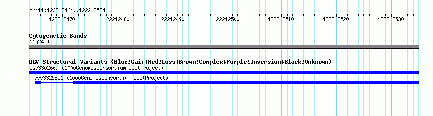 Variant DetailsVariant: esv3302669| Internal ID | 15149617 | | Landmark | | | Location Information | | | Cytoband | 11q24.1 | | Allele length | | Assembly | Allele length | | hg38 | 71 | | hg19 | 71 | | hg18 | 71 |