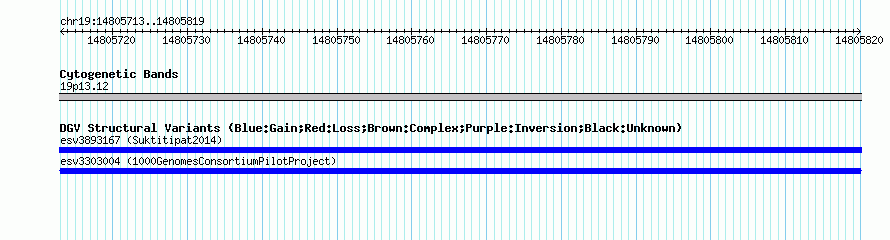 Variant DetailsVariant: esv3303004| Internal ID | 15149952 | | Landmark | | | Location Information | | | Cytoband | 19p13.12 | | Allele length | | Assembly | Allele length | | hg38 | 107 | | hg19 | 107 | | hg18 | 107 |