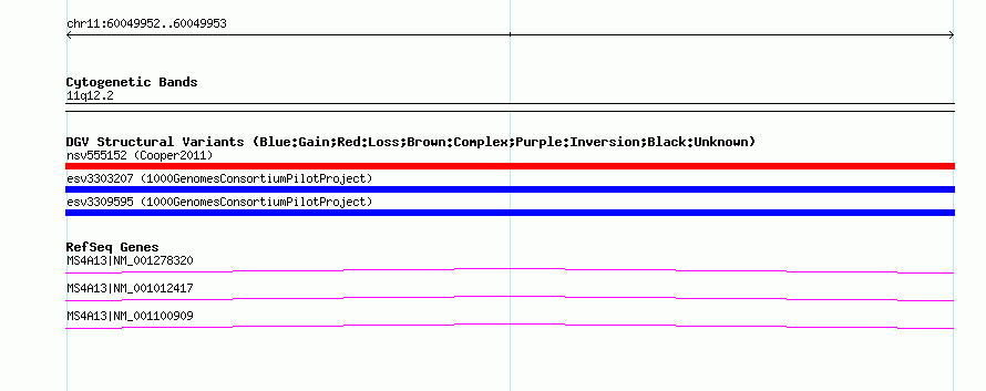 | | Variant Type | CNV mobile element insertion | | Copy Number | | | Allele State | | | Allele Origin | | | Probe Count | | | Validation Flag | | | Merged Status | M | | Merged Variants | | | Supporting Variants | essv7774469, essv7771602, essv7776980, essv7819017, essv7816273, essv7822779, essv7799567, essv7794298, essv7824271, essv7778344, essv7803335, essv7825629, essv7780897, essv7821671, essv7834692, essv7778730, essv7775769, essv7781606, essv7795646, essv7810998, essv7832179, essv7819533, essv7803057, essv7774896, essv7810445, essv7784052, essv7826943, essv7817352, essv7773339, essv7817998, essv7812003, essv7808051, essv7793623, essv7786946, essv7831573, essv7820902, essv7804460, essv7799023, essv7814333, essv7801536 | | Samples | NA12717, NA18861, NA18980, NA18561, NA18603, NA18545, NA12004, NA19005, NA12812, NA18558, NA18960, NA19138, NA18498, NA18970, NA19239, NA18638, NA10847, NA18605, NA12003, NA18956, NA18948, NA18537, NA11919, NA18555, NA18523, NA18593, NA18945, NA18909, NA18564, NA19240, NA07037, NA18501, NA12749, NA19093, NA19116, NA18552, NA12006, NA18511, NA18522, NA18577 | | Known Genes | MS4A13 | | Method | Sequencing | | Analysis | | | Platform | Roche 454 | | Comments | | | Reference | 1000_Genomes_Consortium_Pilot_Project | | Pubmed ID | 20981092 | | Accession Number(s) | esv3303207