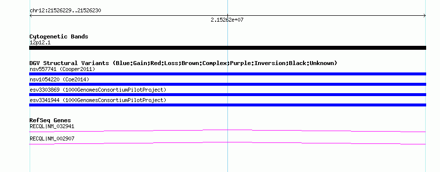 Variant DetailsVariant: esv3303869| Internal ID | 15150817 | | Landmark | | | Location Information | | | Cytoband | 12p12.1 | | Allele length | | Assembly | Allele length | | hg38 | 265 | | hg19 | 265 | | hg18 | 265 |