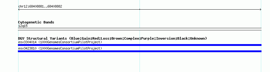 Variant DetailsVariant: esv3304014| Internal ID | 15150962 | | Landmark | | | Location Information | | | Cytoband | 12q15 | | Allele length | | Assembly | Allele length | | hg38 | 50 | | hg19 | 50 | | hg18 | 50 |