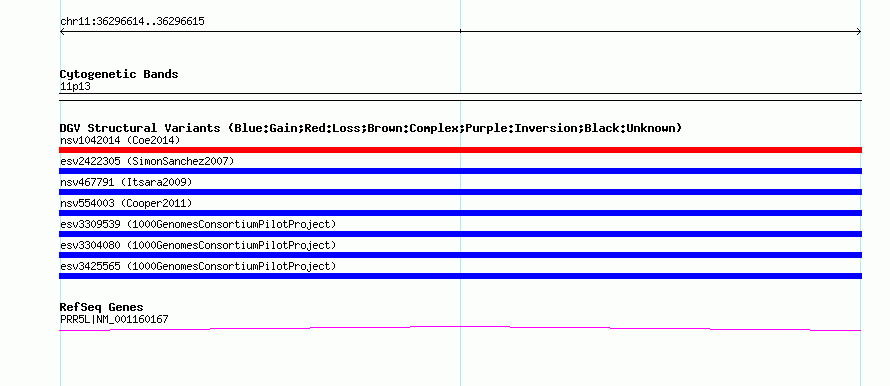 Variant DetailsVariant: esv3304080| Internal ID | 15151028 | | Landmark | | | Location Information | | | Cytoband | 11p13 | | Allele length | | Assembly | Allele length | | hg38 | 222 | | hg19 | 222 | | hg18 | 222 |