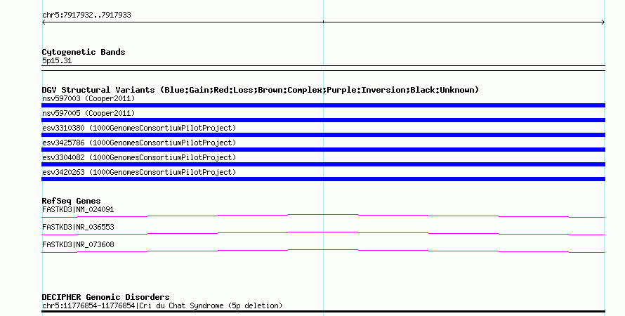 Variant DetailsVariant: esv3304082| Internal ID | 15151030 | | Landmark | | | Location Information | | | Cytoband | 5p15.31 | | Allele length | | Assembly | Allele length | | hg38 | 290 | | hg19 | 290 | | hg18 | 290 |