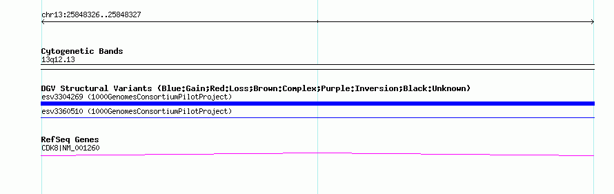 | | Variant Type | CNV mobile element insertion | | Copy Number | | | Allele State | | | Allele Origin | | | Probe Count | | | Validation Flag | | | Merged Status | M | | Merged Variants | | | Supporting Variants | essv7761393, essv7749414, essv7762193, essv7754803, essv7746471, essv7749518 | | Samples | NA18861, NA18489, NA18516, NA18499, NA18858, NA19093 | | Known Genes | CDK8 | | Method | Sequencing | | Analysis | | | Platform | Illumina | | Comments | | | Reference | 1000_Genomes_Consortium_Pilot_Project | | Pubmed ID | 20981092 | | Accession Number(s) | esv3304269
