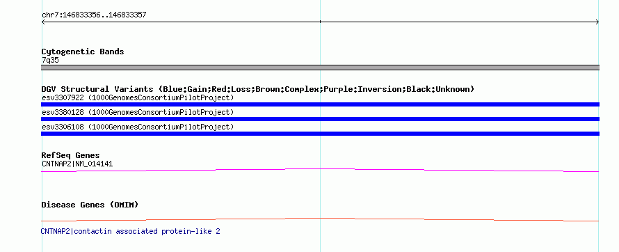 Variant DetailsVariant: esv3306108| Internal ID | 15153056 | | Landmark | | | Location Information | | | Cytoband | 7q35 | | Allele length | | Assembly | Allele length | | hg38 | 291 | | hg19 | 291 | | hg18 | 291 |