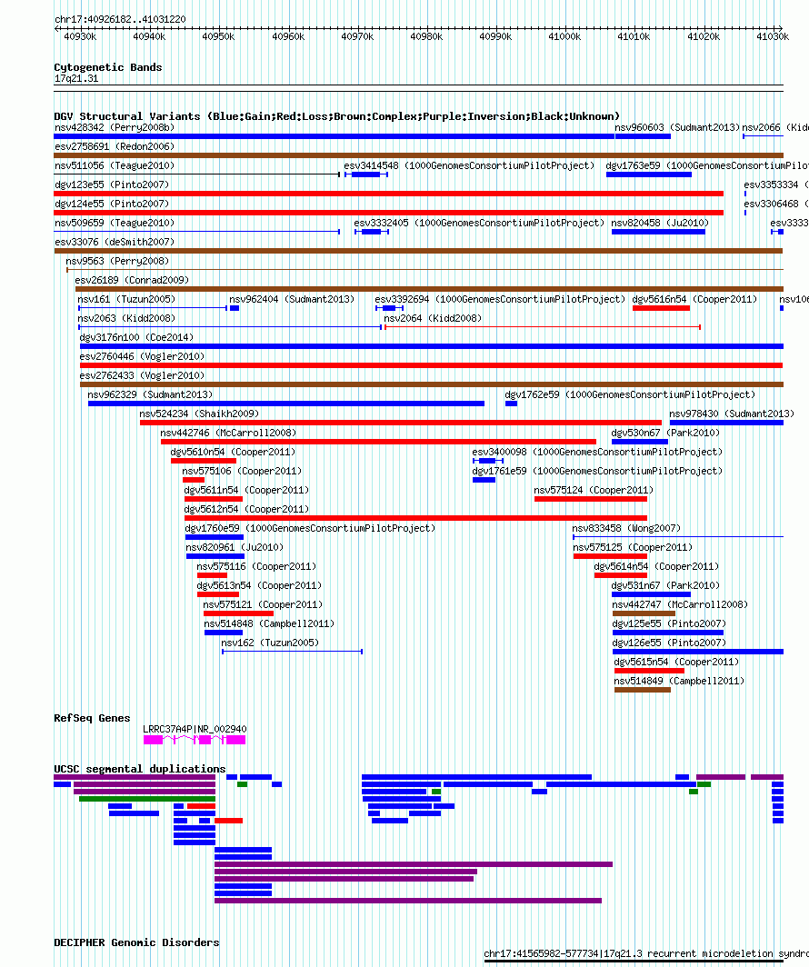 Variant DetailsVariant: esv33076 Internal ID | 12618334 | Landmark | | Location Information | | Cytoband | 17q21.31 | Allele length | Assembly | Allele length | hg38 | 105039 | hg19 | 105039 | hg18 | 105039 | hg17 | 105039 |