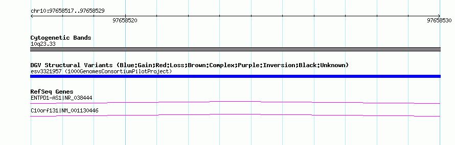 Variant DetailsVariant: esv3321957 | Internal ID | 15168931 | | Landmark | | | Location Information | | | Cytoband | 10q23.33 | | Allele length | | Assembly | Allele length | | hg38 | 289 | | hg19 | 289 | | hg18 | 289 |