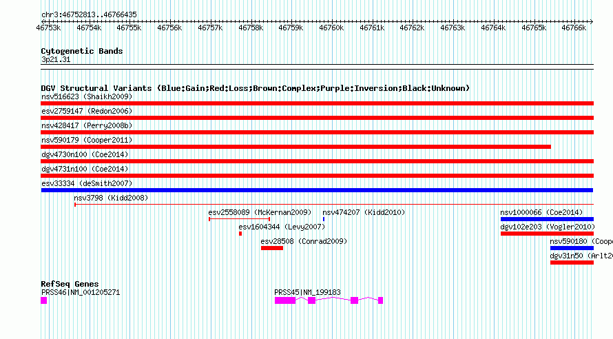 Variant DetailsVariant: esv33334 | Internal ID | 12618592 | | Landmark | | | Location Information | | | Cytoband | 3p21.31 | | Allele length | | Assembly | Allele length | | hg38 | 13623 | | hg19 | 13623 | | hg18 | 13623 | | hg17 | 13623 |