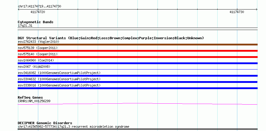 Variant DetailsVariant: esv3338016| Internal ID | 15185003 | | Landmark | | | Location Information | | | Cytoband | 17q21.31 | | Allele length | | Assembly | Allele length | | hg38 | 289 | | hg19 | 289 | | hg18 | 289 |