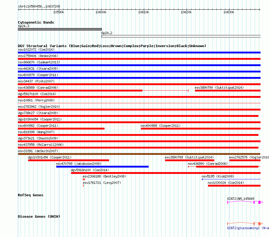 Variant DetailsVariant: esv33391 | Internal ID | 12618649 | | Landmark | | | Location Information | | | Cytoband | 6p24.2 | | Allele length | | Assembly | Allele length | | hg38 | 56753 | | hg19 | 56753 | | hg18 | 56753 | | hg17 | 56753 |