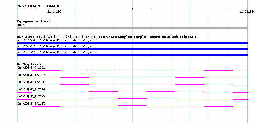 | | Variant Type | CNV insertion | | Copy Number | | | Allele State | | | Allele Origin | | | Probe Count | | | Validation Flag | | | Merged Status | M | | Merged Variants | | | Supporting Variants | essv8920312, essv8920322, essv8920321, essv8920307, essv8920308, essv8920316, essv8920309, essv8920319, essv8920310, essv8920313, essv8920315, essv8920323, essv8920317, essv8920311, essv8920320, essv8920318 | | Samples | NA18947, NA12045, NA18545, NA18526, NA07357, NA18582, NA18964, NA18638, NA18579, NA18948, NA18537, NA18945, NA18564, NA18552, NA18562, NA18577 | | Known Genes | CAMK2D | | Method | Sequencing | | Analysis | | | Platform | Illumina | | Comments | | | Reference | 1000_Genomes_Consortium_Pilot_Project | | Pubmed ID | 20981092 | | Accession Number(s) | esv3340807