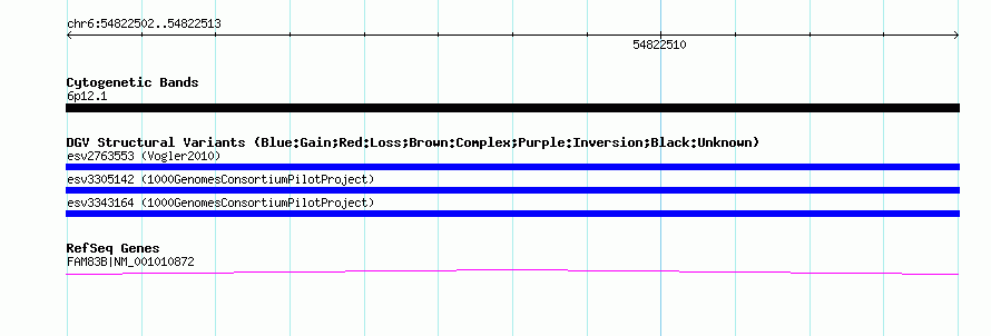 Variant DetailsVariant: esv3343164 | Internal ID | 15190149 | | Landmark | | | Location Information | | | Cytoband | 6p12.1 | | Allele length | | Assembly | Allele length | | hg38 | 289 | | hg19 | 289 | | hg18 | 289 |