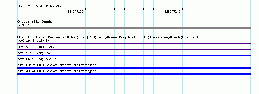 Variant DetailsVariant: esv3343374| Internal ID | 15190359 | | Landmark | | | Location Information | | | Cytoband | 8q24.21 | | Allele length | | Assembly | Allele length | | hg38 | 289 | | hg19 | 289 | | hg18 | 289 |