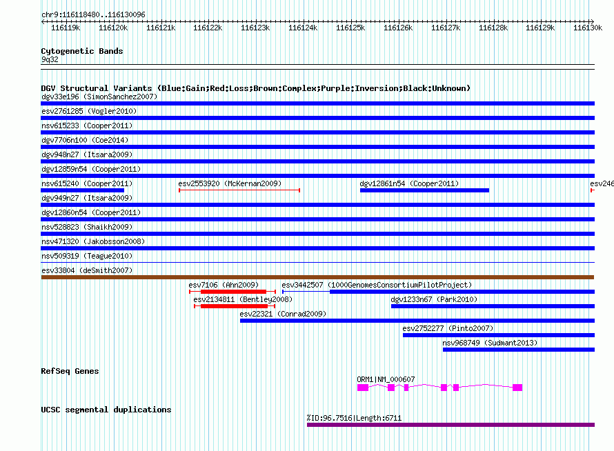 Variant DetailsVariant: esv33804 Internal ID | 12619062 | Landmark | | Location Information | | Cytoband | 9q32 | Allele length | Assembly | Allele length | hg38 | 11617 | hg19 | 11617 | hg18 | 11617 | hg17 | 11617 |