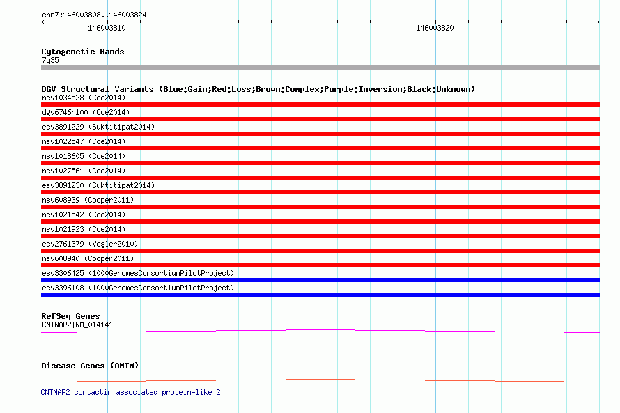 | | Variant Type | CNV insertion | | Copy Number | | | Allele State | | | Allele Origin | | | Probe Count | | | Validation Flag | | | Merged Status | M | | Merged Variants | | | Supporting Variants | essv8937897, essv8937898, essv8937900, essv8937899, essv8937901, essv8937902 | | Samples | NA18870, NA18510, NA18916, NA18498, NA18853, NA18523 | | Known Genes | CNTNAP2 | | Method | Sequencing | | Analysis | | | Platform | Illumina | | Comments | | | Reference | 1000_Genomes_Consortium_Pilot_Project | | Pubmed ID | 20981092 | | Accession Number(s) | esv3396108