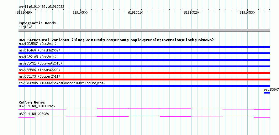 Variant DetailsVariant: esv3408585| Internal ID | 15255547 | | Landmark | | | Location Information | | | Cytoband | 11q12.3 | | Allele length | | Assembly | Allele length | | hg38 | 52 | | hg19 | 52 | | hg18 | 52 |