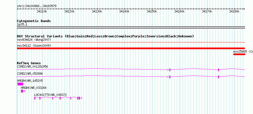 | | Variant Type | CNV loss | | Copy Number | | | Allele State | | | Allele Origin | | | Probe Count | | | Validation Flag | | | Merged Status | M | | Merged Variants | | | Supporting Variants | essv6990721 | | Samples | | | Known Genes | CSMD2, HMGB4, LOC402779 | | Method | SNP array | | Analysis | We further explored the discovery of segmental deletions in the Kosraean population data where IBD is more prevalent, and we observe a larger number of gaps.We used a binomial score to rank potential deletions in homozygous gaps based on the number of mismatching SNPs and the rate of mismatch in the flanking shared segments, measured across all shared segments with the suspected gap. To prioritize the segmental gaps that were most likely to be representative of a deletion, we developed a scoring function based on the number of mismatching SNPs and levels of homozygosity in the gap. | | Platform | Not reported | | Comments | | | Reference | Gusev_et_al_2009 | | Pubmed ID | 18971310 | | Accession Number(s) | esv34112