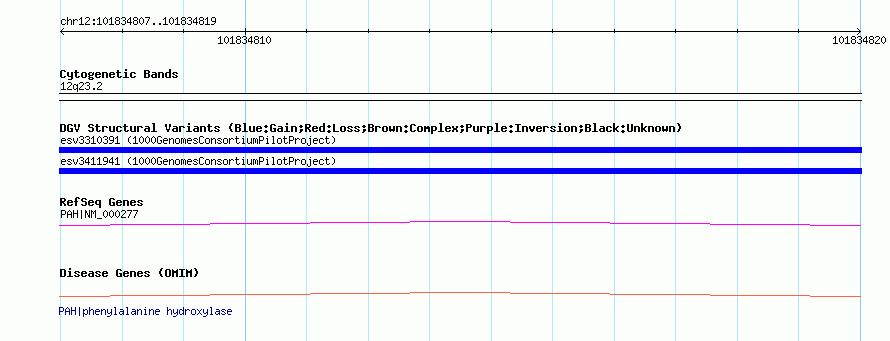 Variant DetailsVariant: esv3411941| Internal ID | 15258900 | | Landmark | | | Location Information | | | Cytoband | 12q23.2 | | Allele length | | Assembly | Allele length | | hg38 | 289 | | hg19 | 289 | | hg18 | 289 |