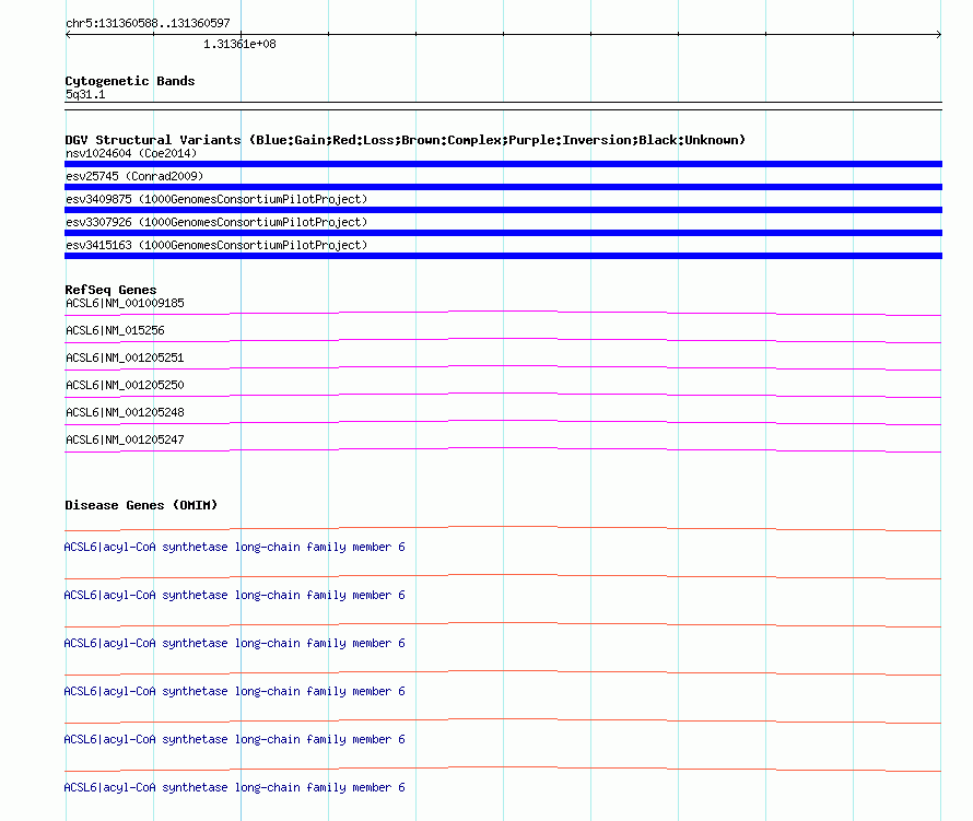Variant DetailsVariant: esv3415163| Internal ID | 15262122 | | Landmark | | | Location Information | | | Cytoband | 5q31.1 | | Allele length | | Assembly | Allele length | | hg38 | 289 | | hg19 | 289 | | hg18 | 289 |