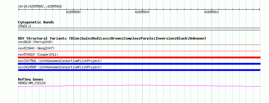Variant DetailsVariant: esv3419585| Internal ID | 15266543 | | Landmark | | | Location Information | | | Cytoband | 18q21.1 | | Allele length | | Assembly | Allele length | | hg38 | 269 | | hg19 | 269 | | hg18 | 269 |