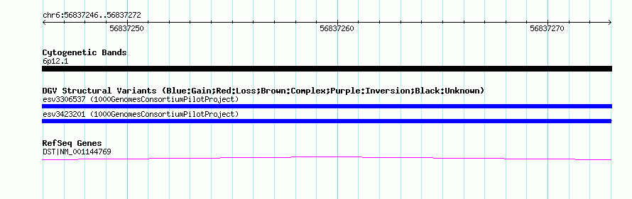 Variant DetailsVariant: esv3423201| Internal ID | 14923473 | | Landmark | | | Location Information | | | Cytoband | 6p12.1 | | Allele length | | Assembly | Allele length | | hg38 | 1058 | | hg19 | 1058 | | hg18 | 1058 |